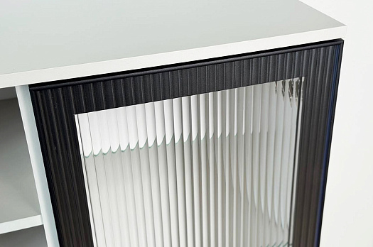 Дизайн комода продуман до мелочей: с одной стороны расположена стеклянная дверца, за которой находится просторное пространство для хранения. С другой стороны – ниша с открытой полкой, выкатной ящик и ещё одна глухая дверца, что позволяет гибко организовать хранение и поддерживать порядок в доме.