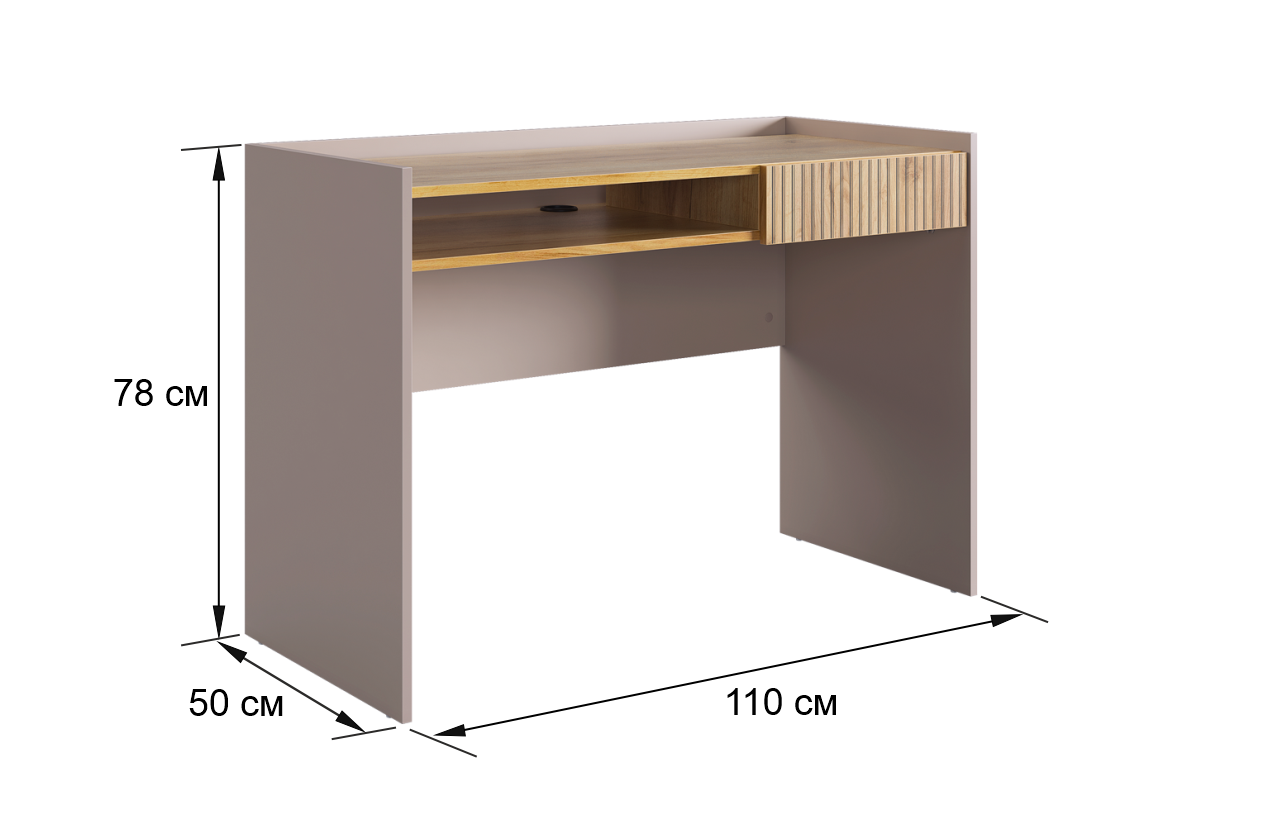 Корпус стола выполнен в цвете кашемир, что придает ему современный и спокойный вид, легко сочетающийся с любым интерьером. Выкатной ящик в цвете "дуб крафт золотой", декорирован принтом, имитирующим вертикальную фрезеровку, что добавляет столу уникальности и роскоши.