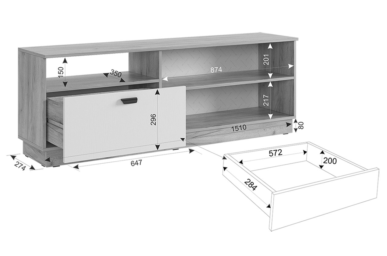 Тумба "Моди"- это вместительный выдвижной ящик, большой отсек с полкой и открытая ниша для мелочей, лучшее решение для гостиной и других комнат.