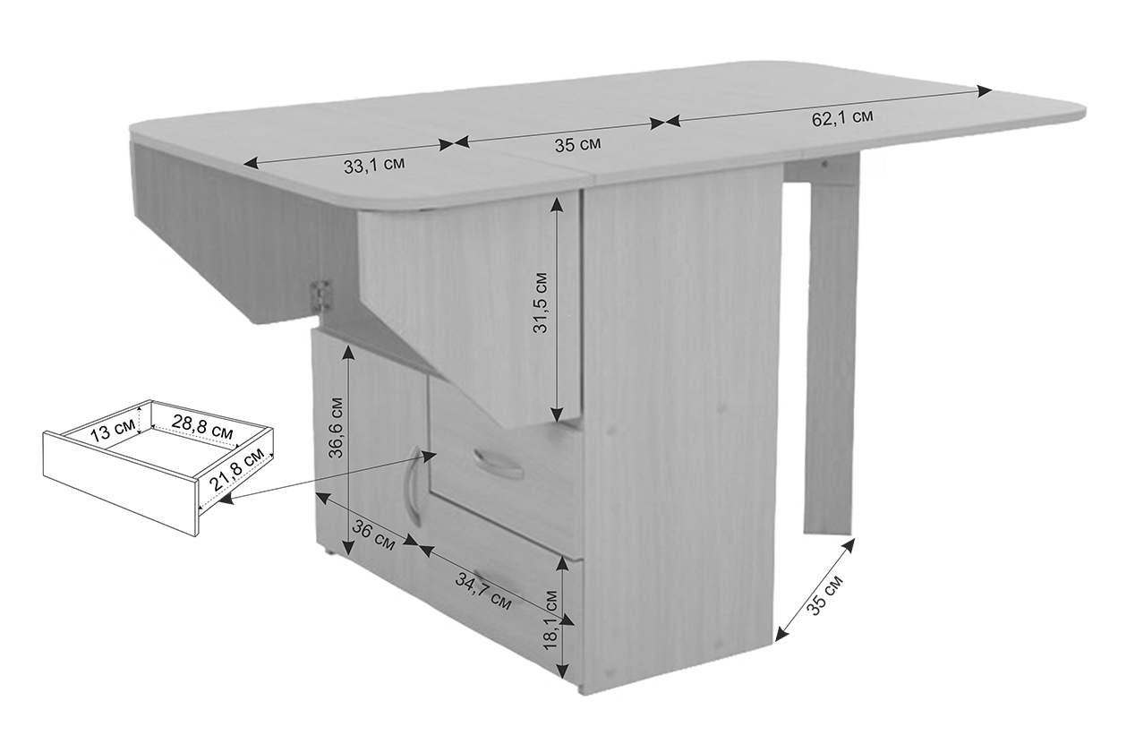 Стол-тумба раскладной: Это изделие сочетает в себе практичность и элегантность. В роли тумбы она предлагает обширные отделения, идеально подходящие для хранения различных предметов - начиная от мелочей и заканчивая обувью. Главная особенность - инновационный механизм, который позволяет превратить верх тумбы в просторный стол. Высший класс для тех, кто ищет гармонию удобства и стиля в интерьере. В полностью раскладном виде, ширина стола достигает 1300 мм.