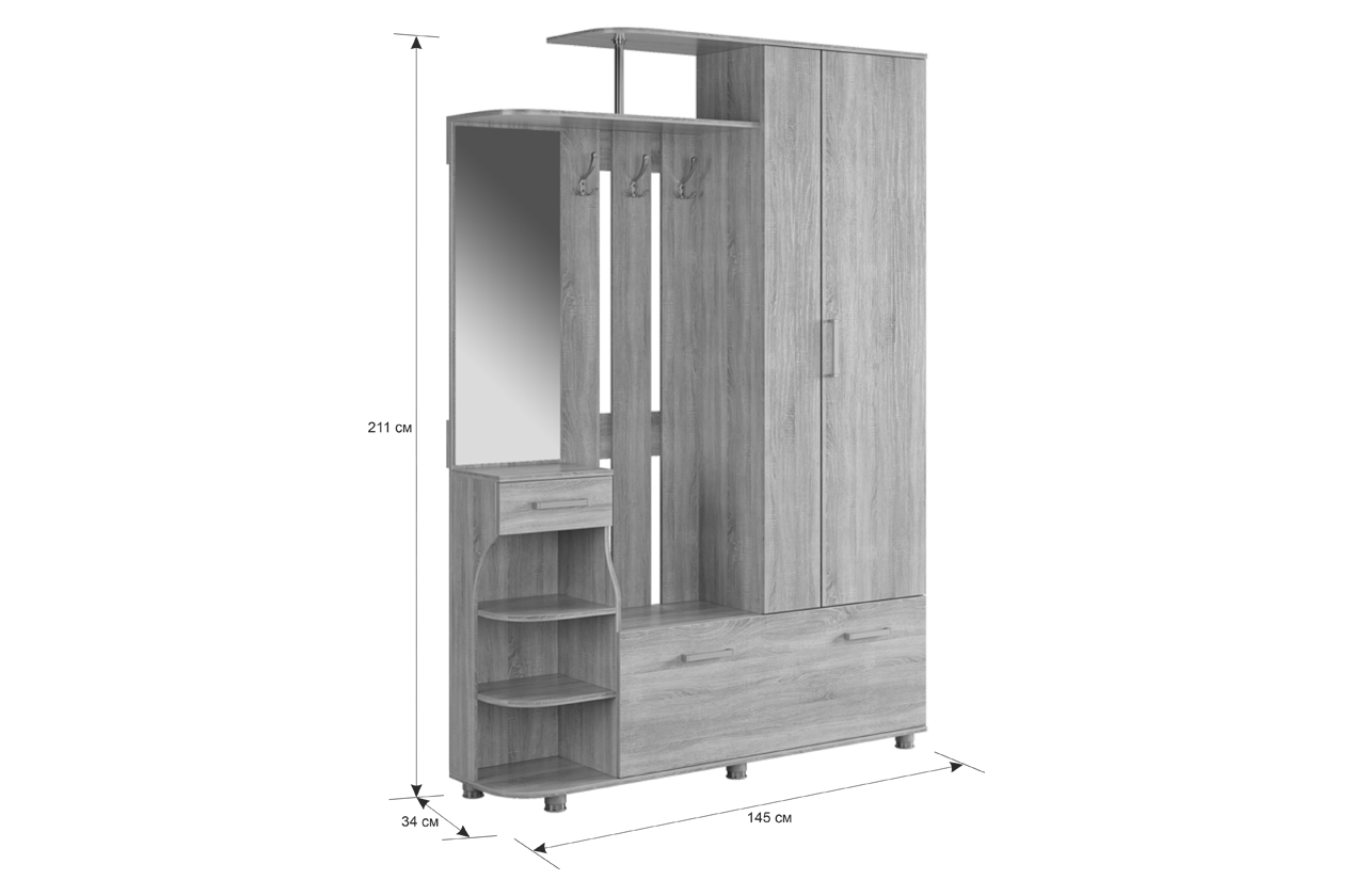 Ширина (мм): 1450. Глубина (мм): 340. Высота (мм): 2110.