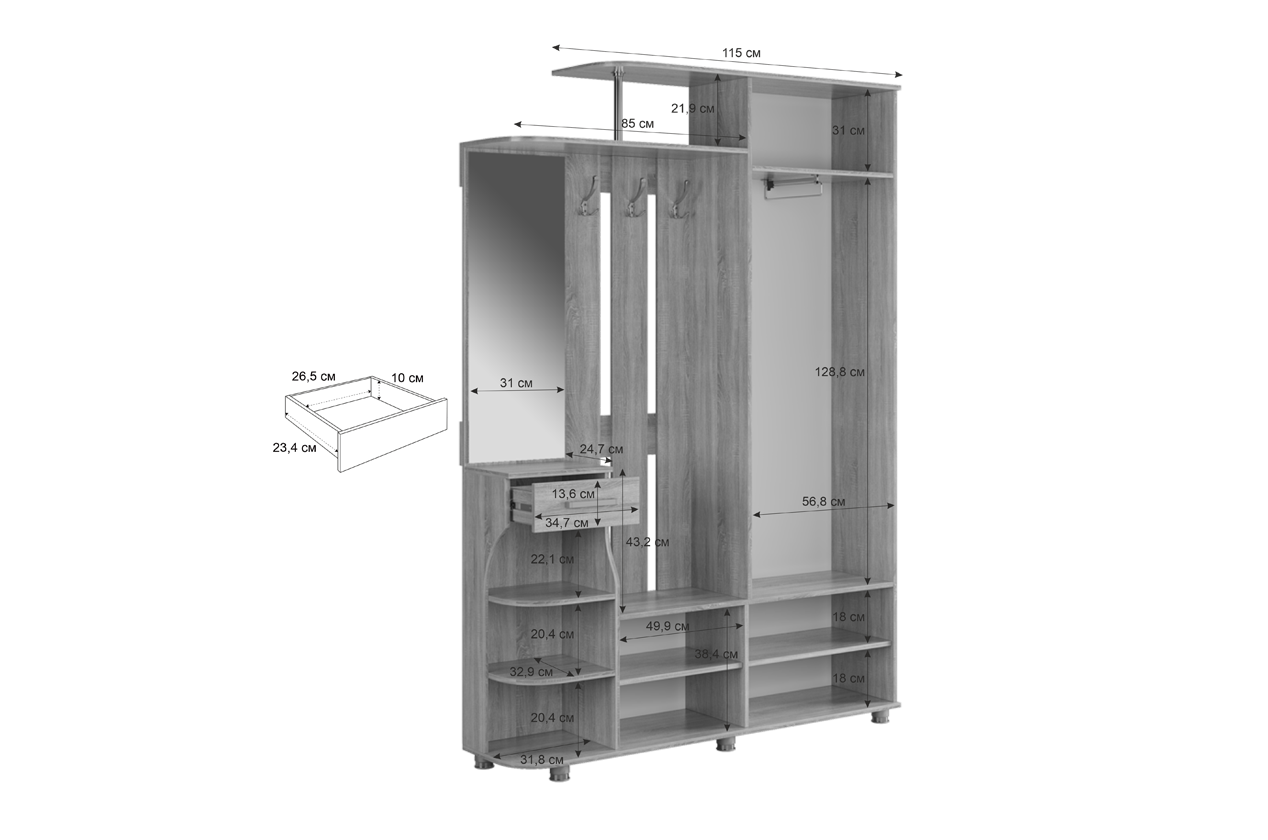 Прихожая Барселона-2: идеальное решение для максимизации пространства в вашей прихожей, объединяющее в себе все ключевые элементы для комфортного размещения одежды и аксессуаров.