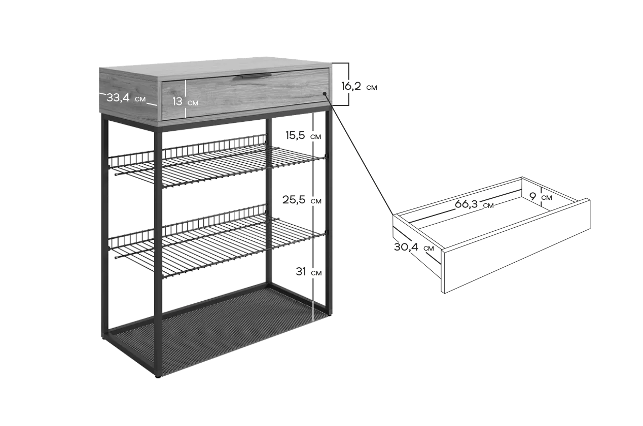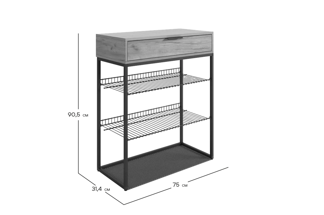 Обувница Краш прекрасно сочетает в себе стиль и функциональность. Её дизайн в стиле лофт идеально подходит для современных интерьеров. Выдвижной ящик с шариковыми направляющими обеспечивает бесшумное и плавное открывание, предоставляя удобный доступ к вашим аксессуарам и мелочам. Регулируемые опоры и специальный коврик обеспечивают дополнительный комфорт и защиту.