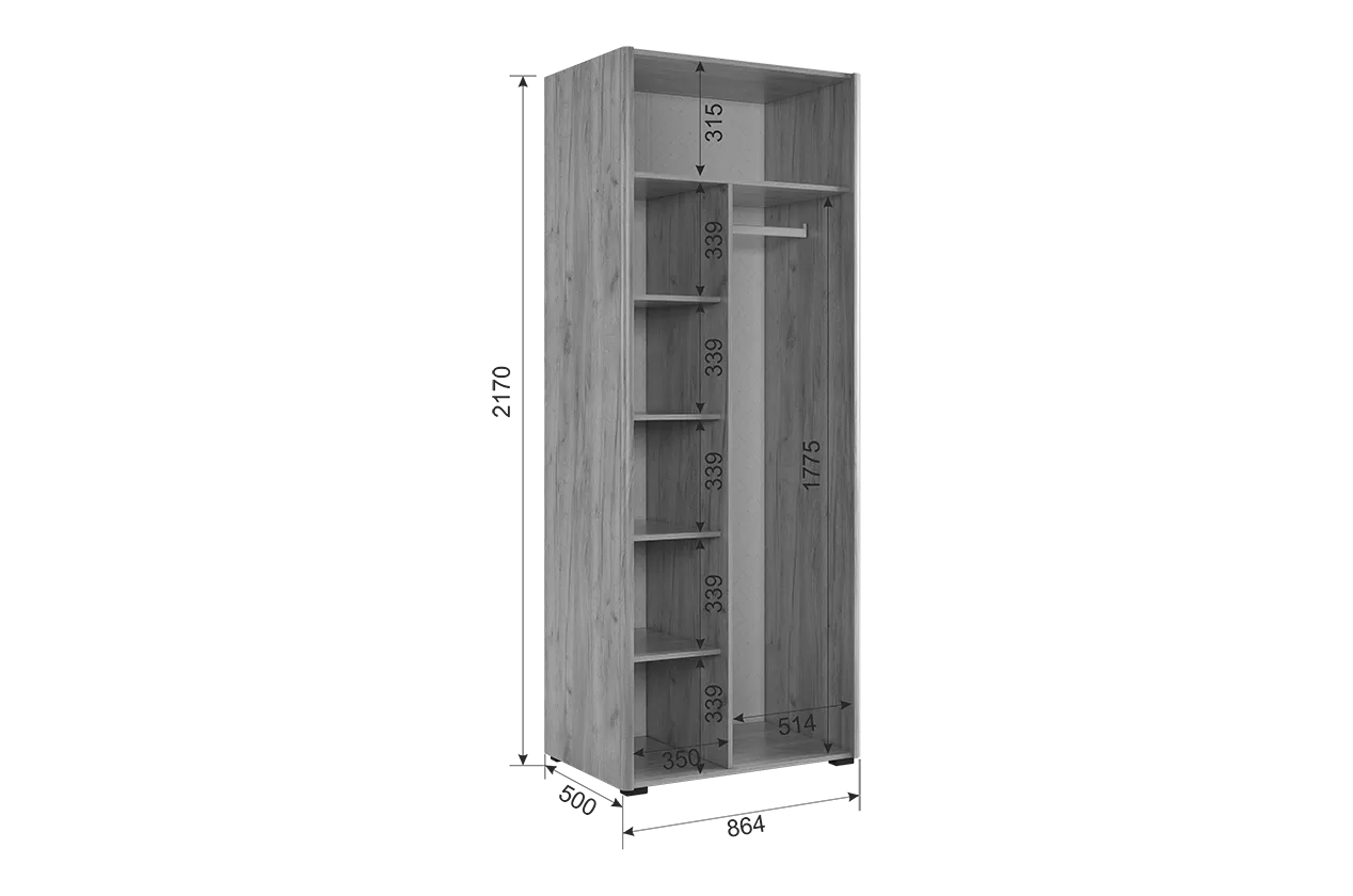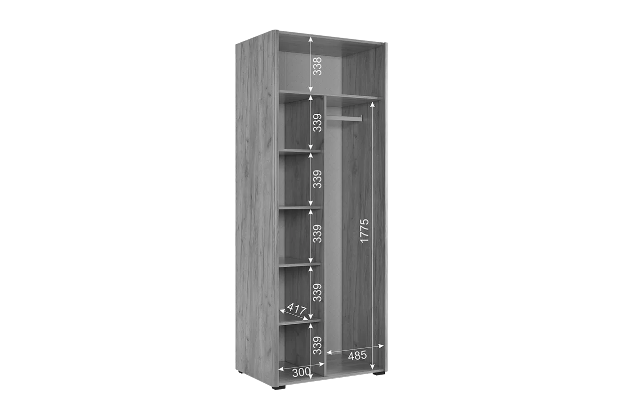 Состоит из: пяти полок и штанги для одежды.