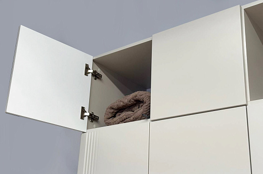 Особое внимание заслуживает фрезеровка фасадов, которая придаёт антресоли изысканный вид. Толкатели PUSH вместо ручек обеспечивают удобное открывание нажатием.