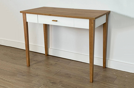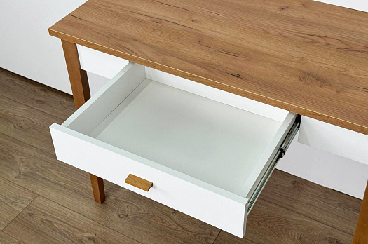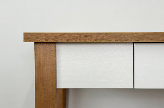 Корпус стола выполнен из ЛДСП в цвете белое дерево, что придаёт ему светлый и уютный вид. Усиленная столешница из ЛДСП толщиной 22 мм в цвете дуб крафт золотой обеспечивает прочность и создаёт изысканный акцент в интерьере.